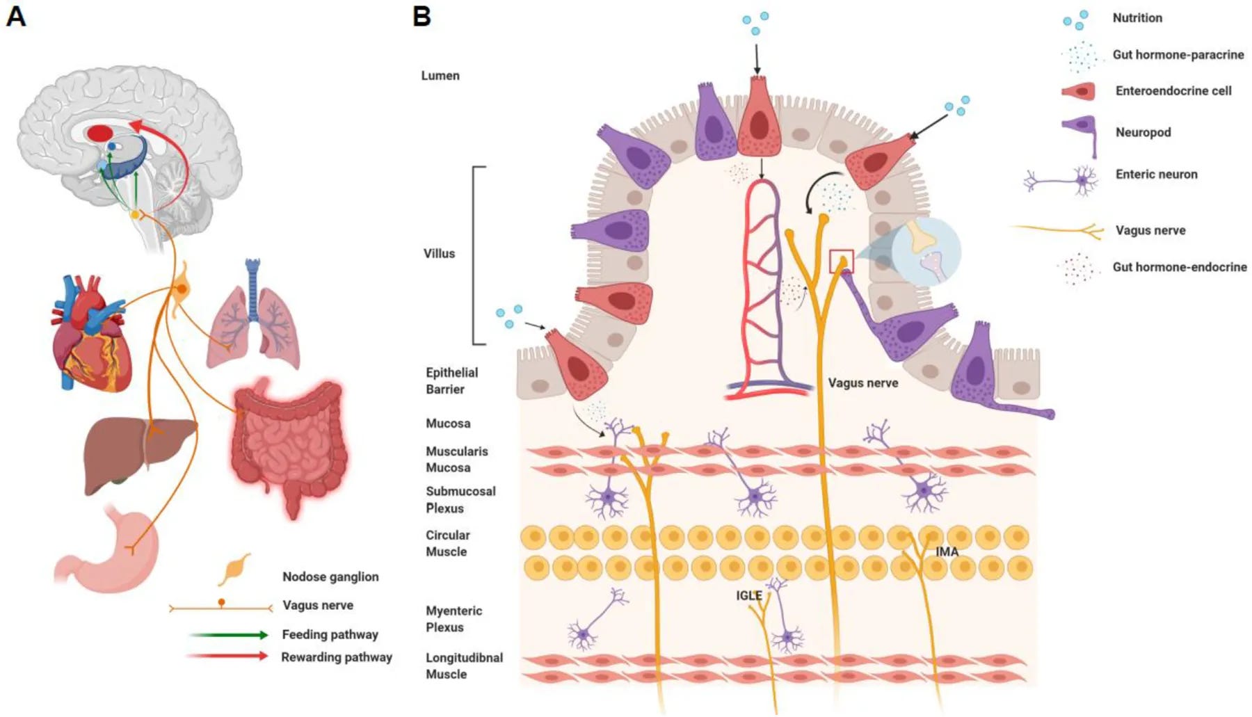 - Local signaling. Both GABA-A and NDMA receptors are present on vagal afferents, meaning that compounds produced in the intestinal wall may act locally while transmitting effects to the brain via gut–brain pathways. A similar principle is seen with gut-derived serotonin, which can influence brain function via local/paracrine/vagal routes without necessarily depending on bloodstream levels.